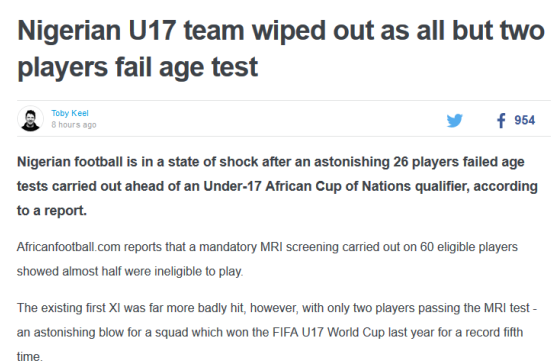 Found this hilarious report on Euro Sport. According to the report, 26 players of Nigeria’s Under 17 team passed the age test. Read the report below…