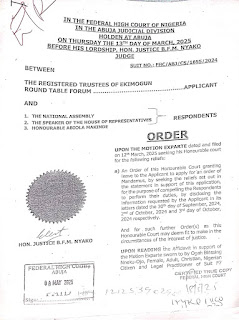 The Federal High Court sitting in Abuja has granted leave to the Registered Trustees of the Ekimogun Roundtable to apply for an order of Mandamus against the National Assembly, the Speaker of the House of Representatives, and Honourable Abiola Makinde, the member representing Ondo East/West Federal Constituency.