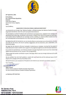 Our Principal, Engr. IfeOluwa Oyedele appealed to members of the All Progressives Congress, APC and the entire citizens of the Sunshine State to rally around to ensure the success of APC in the election scheduled to take place on November 16, 2024.” Olukoju remarked.