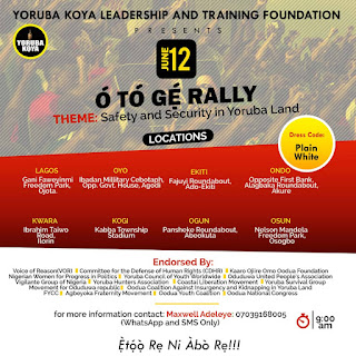 The rally, tagged JUNE 12 OTOGE RALLY, backed by a Yoruba Intelligentsia group, Voice of Reason (VOR) and 26 other socio-cultural and self-determination groups will hold in all Yoruba Speaking State capitals of Ondo, Oyo, Ekiti, Lagos, Osun, Ogun, Kogi and Kwara States respectively.