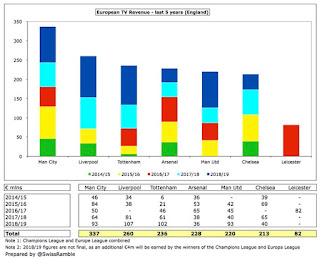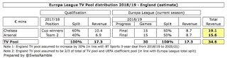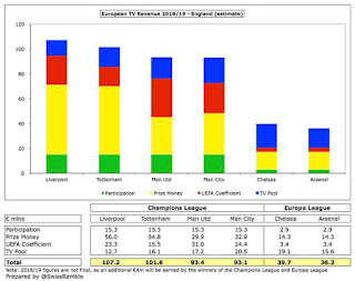 Chelsea’s drop can be easily explained by the fact they were in the Champions League last term, from which they earned €65m, but Arsenal are on course to earn less from the Europa League despite the fact they have gone one stage further than 2017-18.