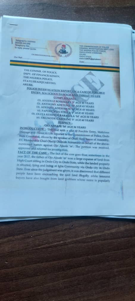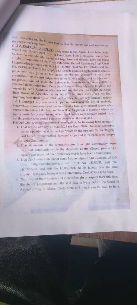 Let it be clear that Ajisafe is far from the saint he claims to be. Reliable records from law enforcement and judicial quarters show that he is currently facing two separate criminal cases bordering on murder, one instituted in 2021 with charge number MBD/2C/2021, and another in 2023 with charge number MAT/583C/2022. Though Ajisafe remains innocent until proven guilty, this clarification is necessary to put the facts straight and ensure that the public knows who he truly is, especially in light of the issue he’s now trying to twist. Beyond that, several petitions and investigations are linking him to organised land-grabbing schemes across Ondo East and neighbouring communities, areas long notorious for violent encroachments, false petitions, and the use of police intimidation to dispossess rightful landowners.